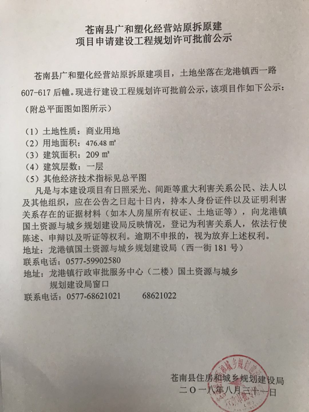 苍南县广和塑化经营站原拆原建项目,土地坐落在龙港镇西一路607-617后幢。现进行建设工程规划许可批前公示,该项目作如下公示:(附总平面图如图所示)
