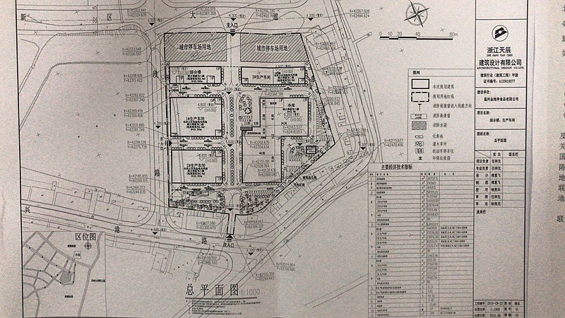 温州金海岸食品有限公司建设项目,土地坐落在龙港镇兴港路以北。原建设工程规划许可证在2015年12月11日核准建设规模为44993.56平方米;现调整冷库原一层变更二层、增加配电房。现进行建设工程规划许可变更批前公示,该项目作如下公示:(附总平面图如图所示)