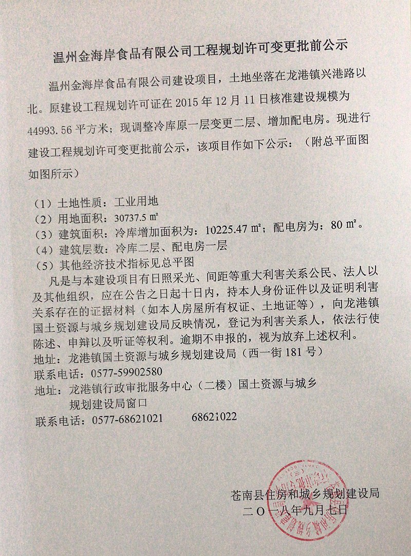 温州金海岸食品有限公司工程规划许可变更批前公示