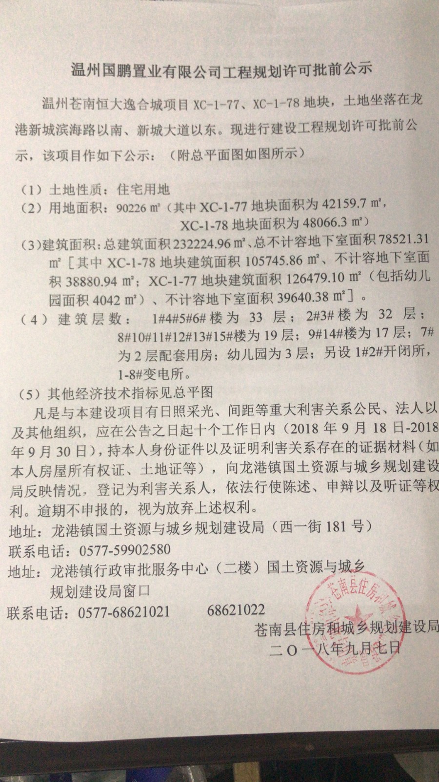 凡是与本建设项目有日照采光、间距等重大利害关系公民、法人以及其他组织,应在公告之日起十个工作日内(2018年9月18日-2018年9月30日),持本人身份证件以及证明利害关系存在的证据材料(如本人房屋所有权证、土地证等),向龙港镇国土资源与城乡规划建设局反映情况,登记为利害关系人,依法行使陈述、申辩以及听证等权利。逾期不申报的,视为放弃上述权利。
