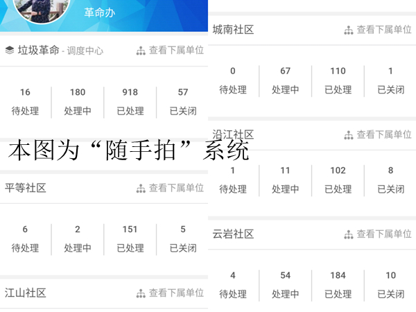 本次考核首次加入的“随手拍”系统是龙港“垃圾革命”工作创新一项机制,它借助科技力量,强化对驻村干部、村居干部轨迹监管,及时督促保洁公司做好垃圾清理和保洁工作,确保每一个地段,有人抓、有人管,同时要彻底整治垃圾死角,杜绝返潮现象。从8月31日运行不到一个月,提交整改点达2091个,处置1820个,处理中271个,一举解决了市场化保洁监管难的问题。