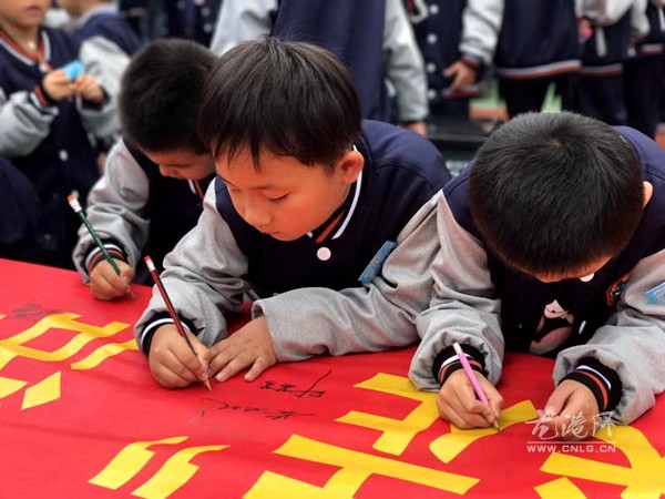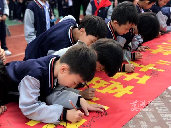 最后,孙校长和全体教师以及各班学生在“大手牵小手 垃圾分类走”横幅上郑重签名,作出庄重承诺,从自身做起,在日常学习、生活中自觉做到垃圾分类。