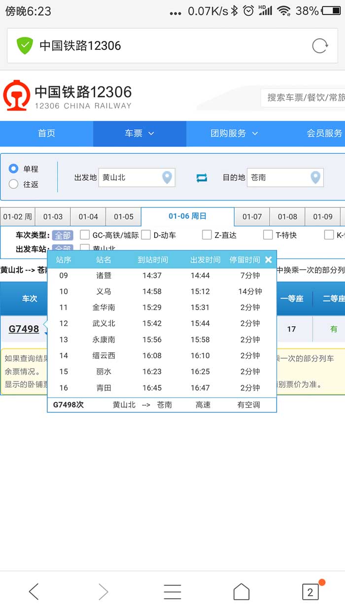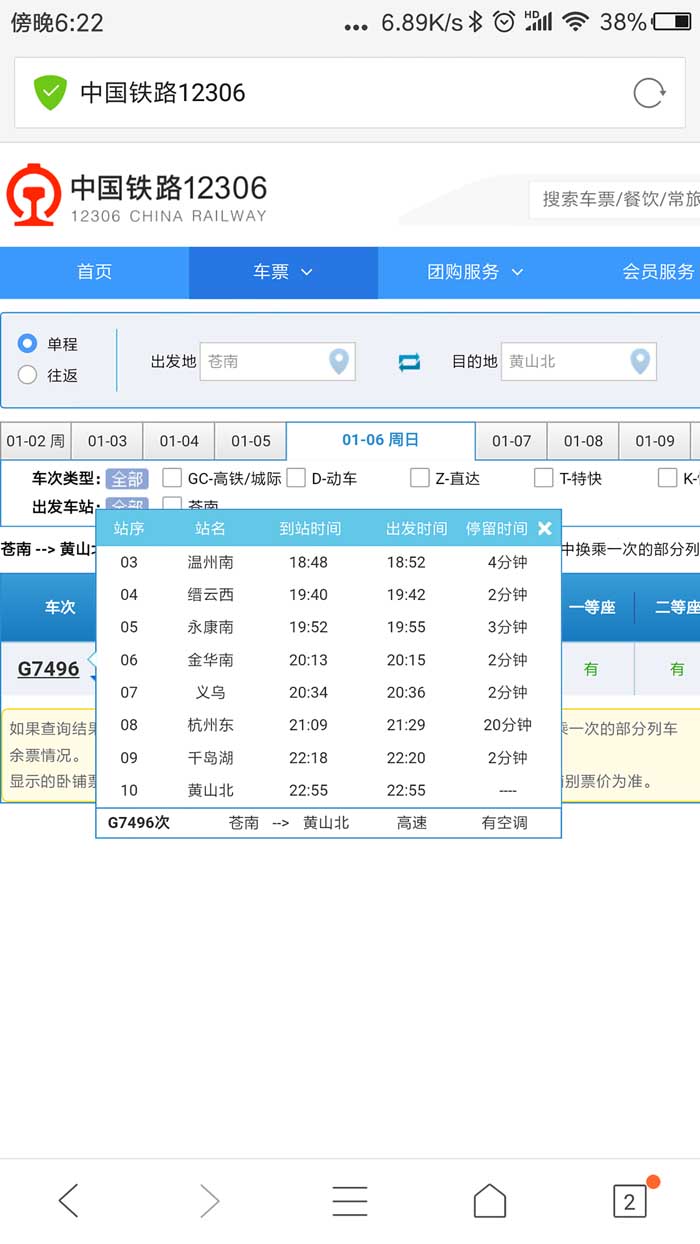 而由黄山北站始发终到苍南站的高铁为G7498次。该趟高铁定于1月6日中午11时54分由黄山北站首发,17时46分至苍南站。
