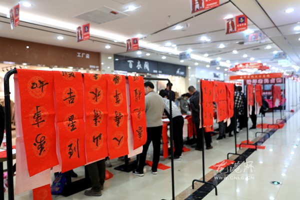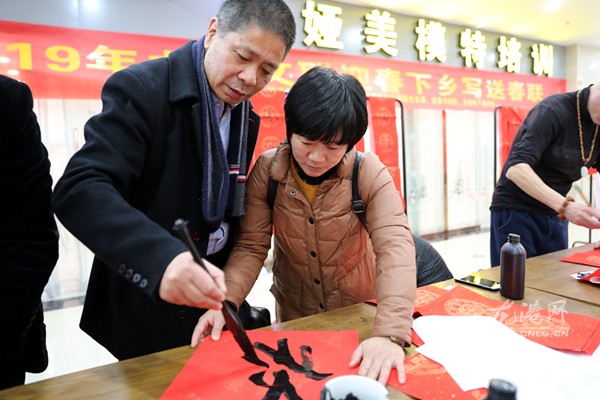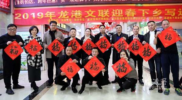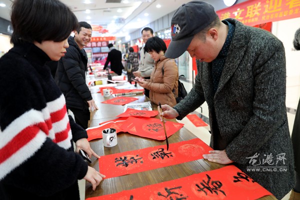 今天下午,龙港镇地下商场人头攒动、热闹非凡,由镇文联牵头组织的“2019年龙港文联迎春下乡写送春联”活动正在这里开展,10多名书法家为村民写春联,把祝福送给广大村民,受到商场里的商户和群众的热烈欢迎。