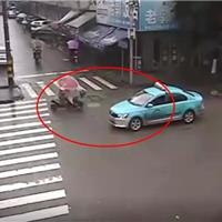 近日,苍南龙港镇人民路与蔡家街路口,一辆出租车与一辆电动车互不礼让,出租车撞在电动车右后侧,电动车驾驶员被甩出打了个滚。