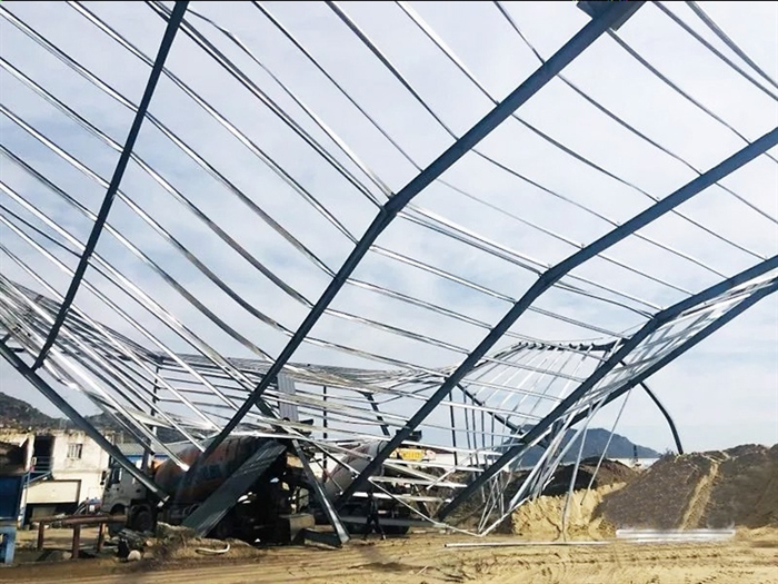 日前,龙港大桥西路某混泥土公司厂区内,一辆混凝土运输车倒车失误,不慎将新建钢架结构的房屋给撞塌了。