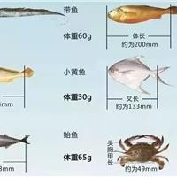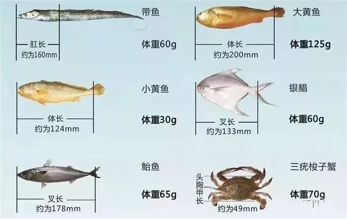 我省海洋渔业资源保护品种的6种最小可捕过渡性规格。带鱼:体重60克、银鲳:体重60克、大黄鱼:体重125克、鲐鱼:体重65克、小黄鱼:体重30克、三疣梭子蟹:体重70克。