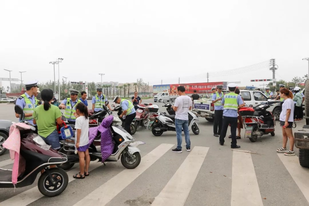 在世纪大道与西一路交叉口,人民路等地,交警正逐一拦下未佩戴安全头盔或违法加装的雨蓬的二轮电动车,为车辆粘贴“电动车安全警示标语”,指导群众扫描二维码观看交通安全警示片并对违法车辆进行置留七日的处理。行动中,交警耐心地对违规电动车驾驶员进行劝导,解释新规政策。