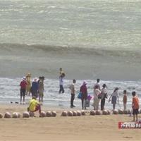 【现场声】工作人员:“各位游客,受台风影响,请大家不要下去游泳,撤离到沙滩游玩。”