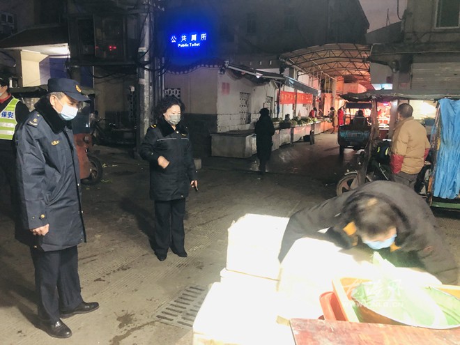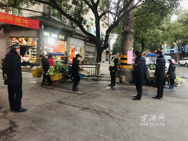 在第一、三菜市场周边,执法人员不间断对马路市场、流动摊点进行疫情防控宣传工作,全力劝导菜农挑担入市并提醒佩戴口罩经营,对流动摊贩进行坚决取缔。针对马路临时市场摊点摆放的流动性、不稳定性,中队采取蹲点值守与巡查执法、堵疏结合的方式,掌控马路市场的反弹,有效防控马路市场摊贩经营引起交叉感染,对外围占道出售蔬菜的商贩进行劝离,保障市容环境正常。