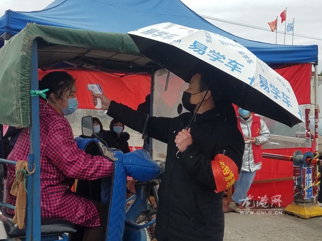 黄贤伟正在防疫卡点为过往车辆上的人员检测体温
