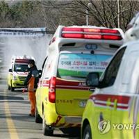 排队驶入庆尚北道庆山市的新冠肺炎患者专用救护车,摄于3月5日。 图/韩联社