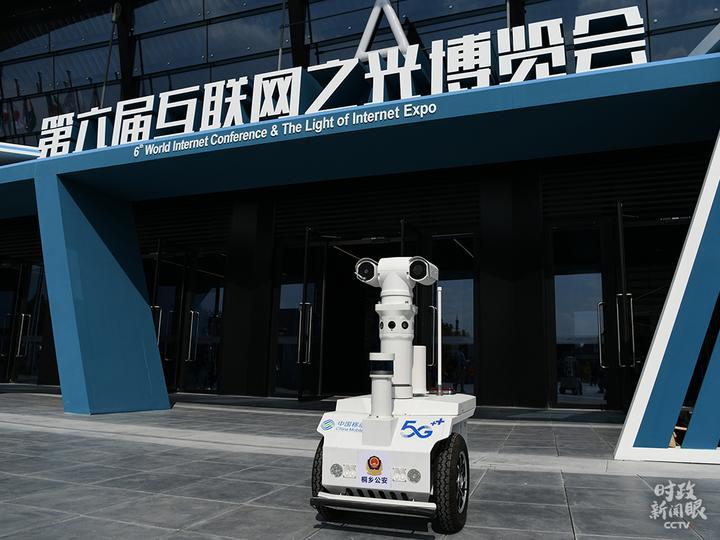 这是“互联网之光”博览会展馆前的5G警用机器人。
