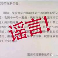 近日,龙港市公安局在网上巡查发现,一则落款为温州市龙港市政府的“返乡公告”在网络传播。该“返乡公告”编造了“受疫情防控影响决定于2020年12月29日(农历十一月十五日)所有外来人员无本市定居人员开始返乡,十五日内全部返乡······”等虚假信息。