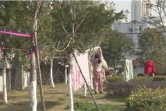 近日天气晴好,不少市民纷纷将被子、衣物拿出来晒晒太阳,杀杀菌。可晾晒也要“讲文明”, 随意在沿江路一带的绿化带上晒被子和衣物,这种行为既不卫生也影响了市容市貌。