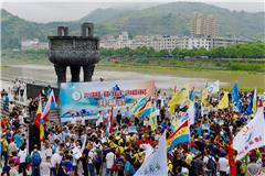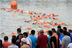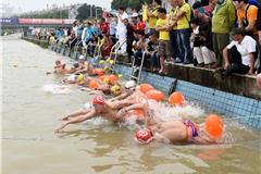 5月8日,参加比赛的选手们游向终点。当日,2016年中国福鼎“太姥山杯”公开水域游泳锦标赛在福建省福鼎市桐山溪举行,来自全国近80支游泳队参与了角逐,龙港冬泳协会获得团体总分季军。